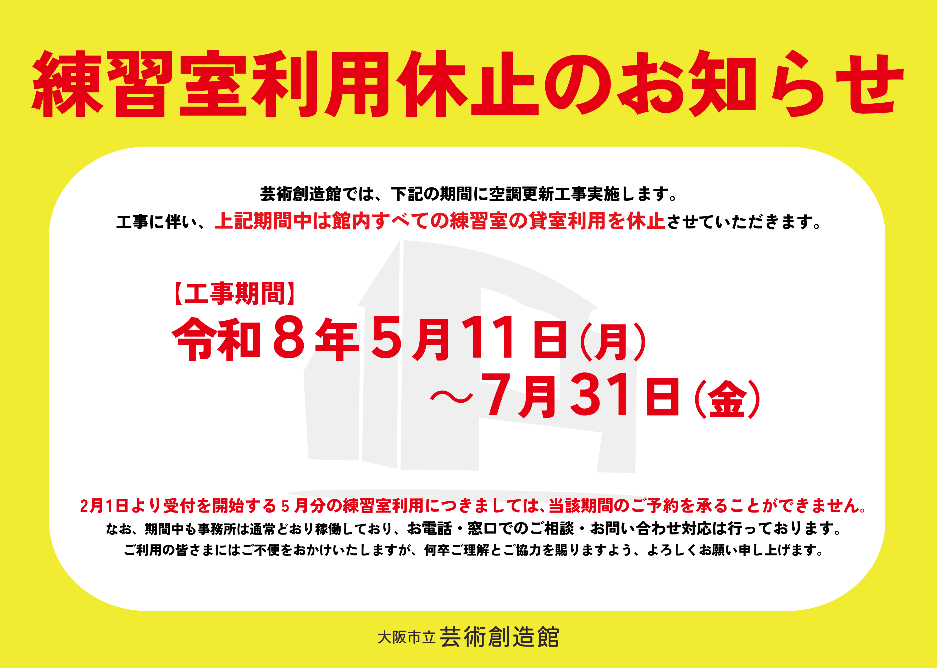 【重要】空調更新工事に伴う練習室利用休止のお知らせ